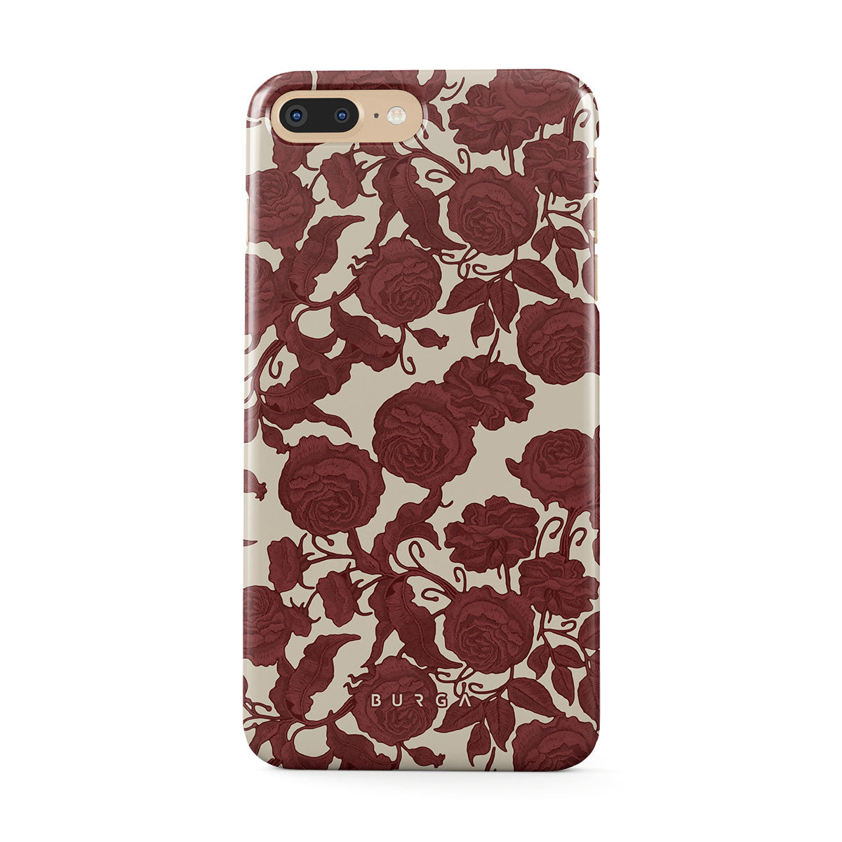 Główne elementy projektu: ciemnoczerwone róże, misterny wzór kwiatowy, wzór vintage.