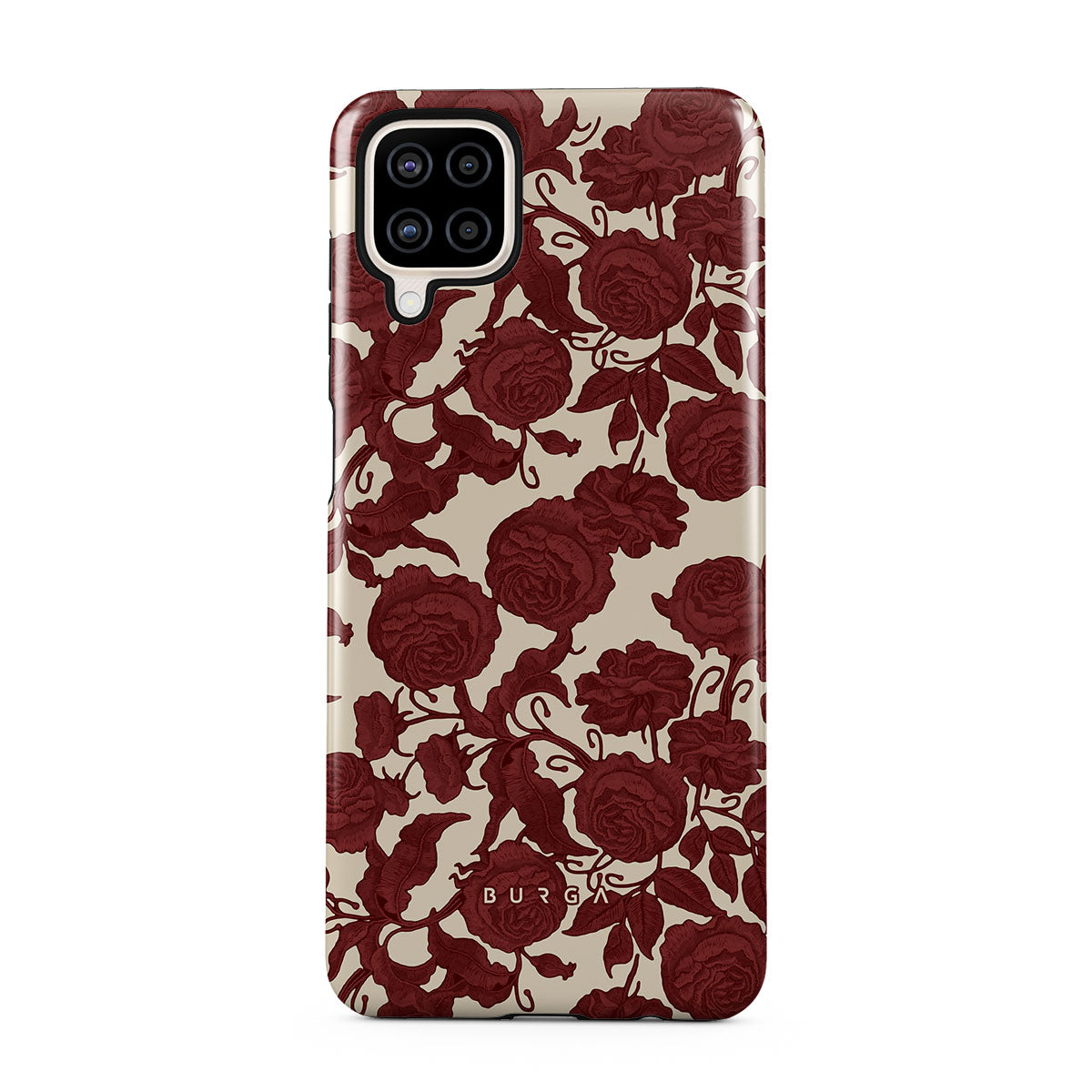 Główne elementy projektu: ciemnoczerwone róże, misterny wzór kwiatowy, wzór vintage.