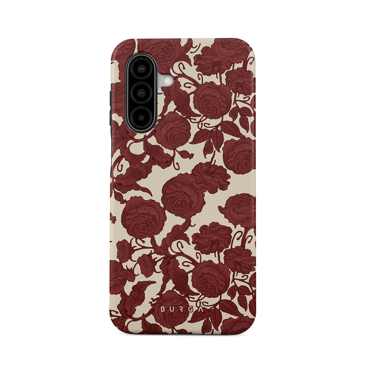 Główne elementy projektu: ciemnoczerwone róże, misterny wzór kwiatowy, wzór vintage.