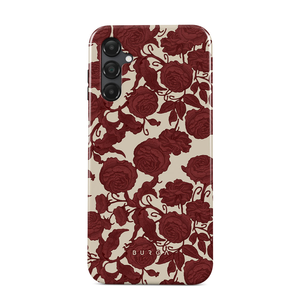 Główne elementy projektu: ciemnoczerwone róże, misterny wzór kwiatowy, wzór vintage.
