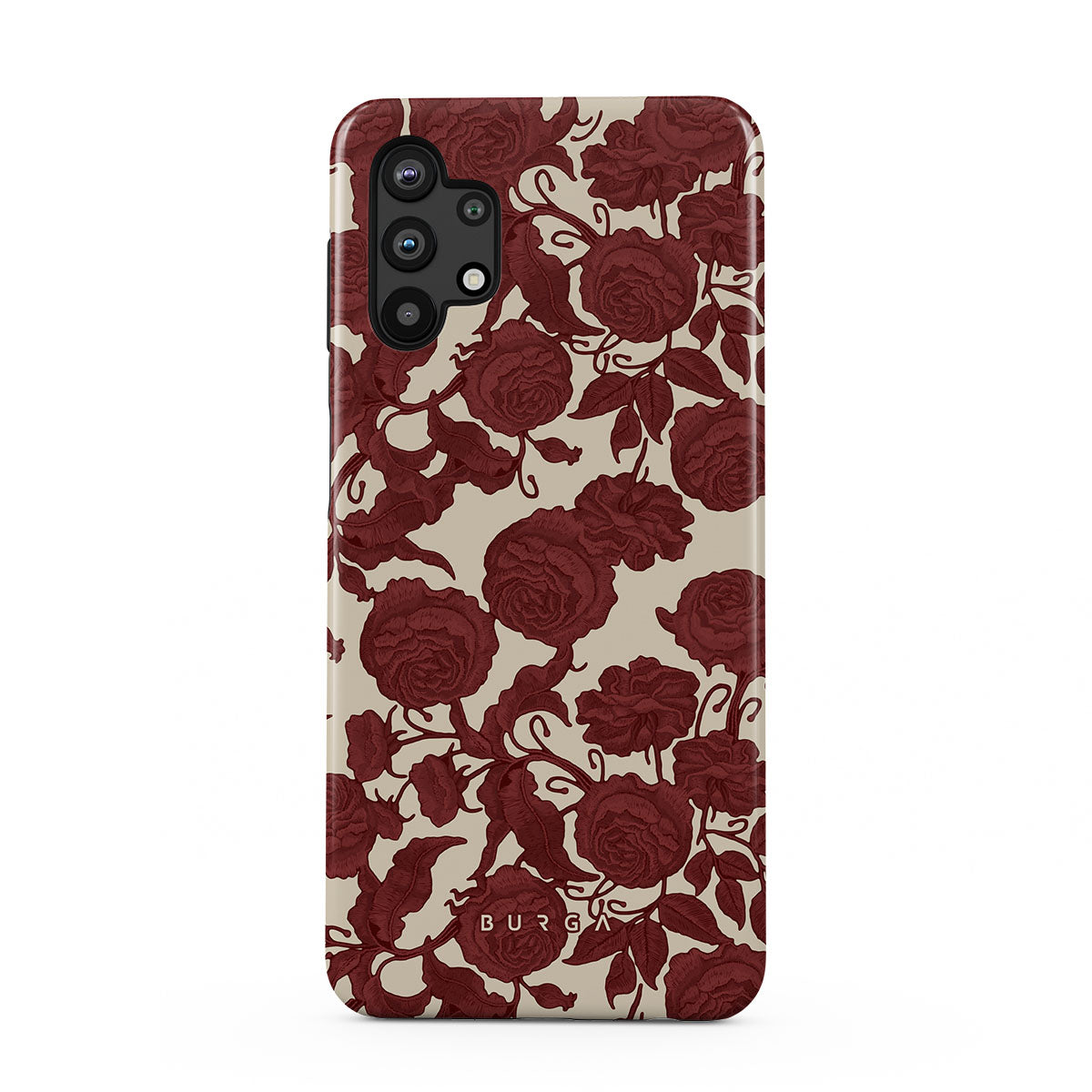 Główne elementy projektu: ciemnoczerwone róże, misterny wzór kwiatowy, wzór vintage.