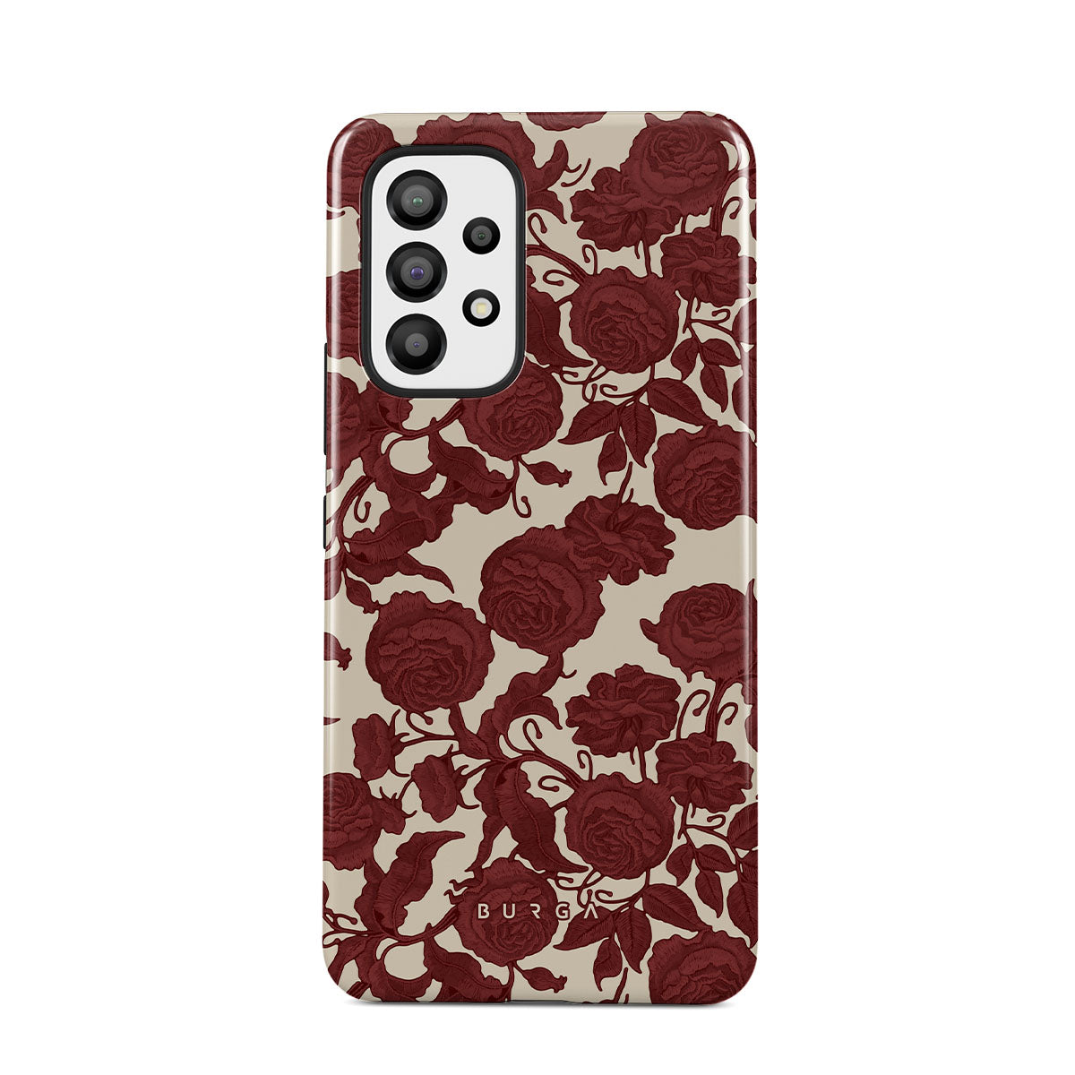 Główne elementy projektu: ciemnoczerwone róże, misterny wzór kwiatowy, wzór vintage.