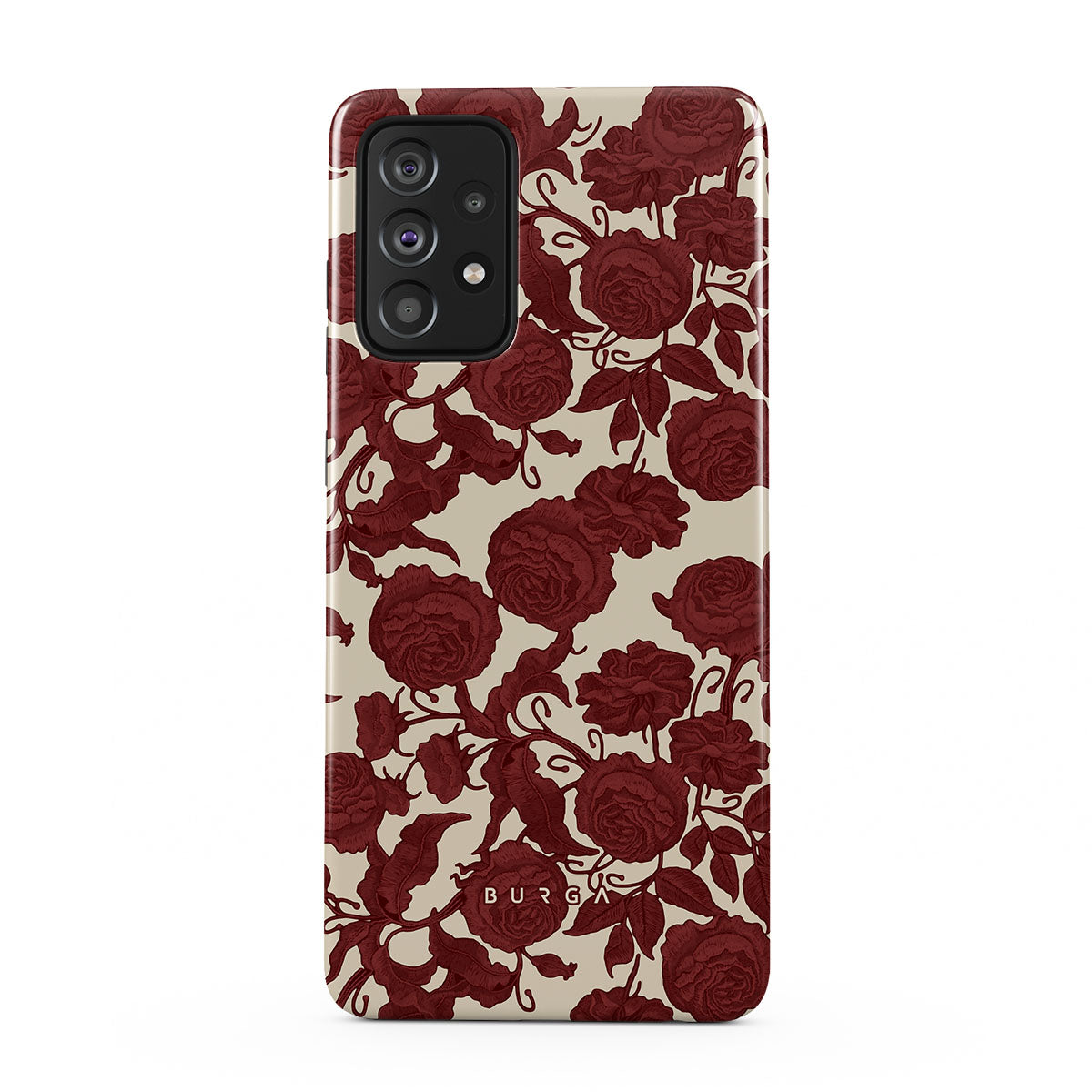 Główne elementy projektu: ciemnoczerwone róże, misterny wzór kwiatowy, wzór vintage.