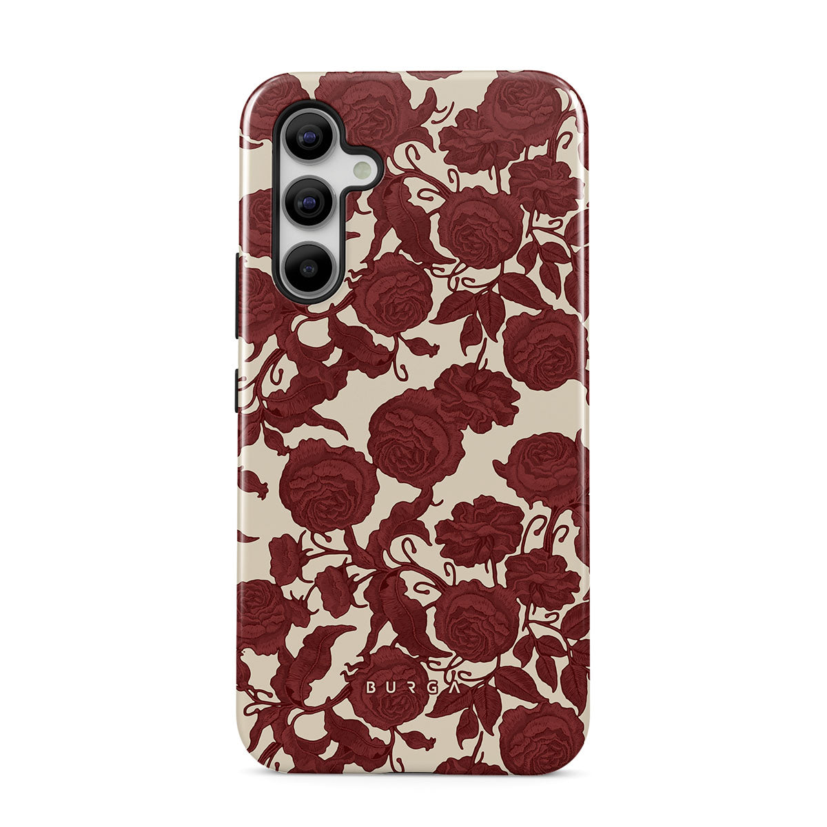 Główne elementy projektu: ciemnoczerwone róże, misterny wzór kwiatowy, wzór vintage.