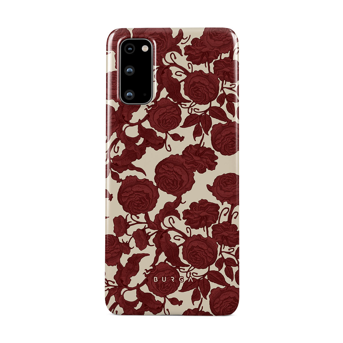 Główne elementy projektu: ciemnoczerwone róże, misterny wzór kwiatowy, wzór vintage.