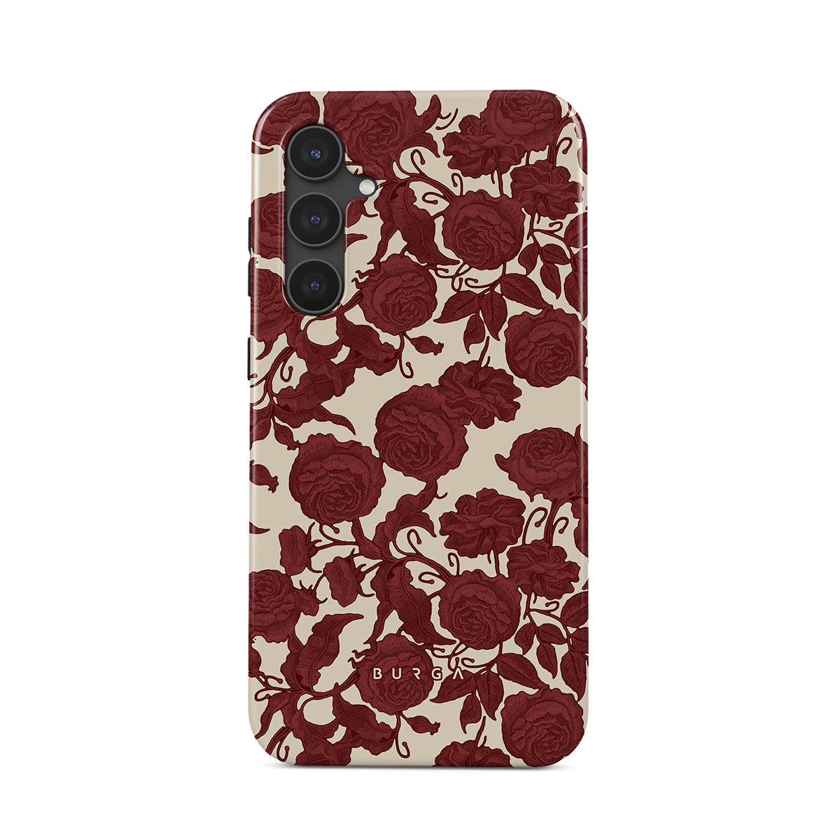 Główne elementy projektu: ciemnoczerwone róże, misterny wzór kwiatowy, wzór vintage.