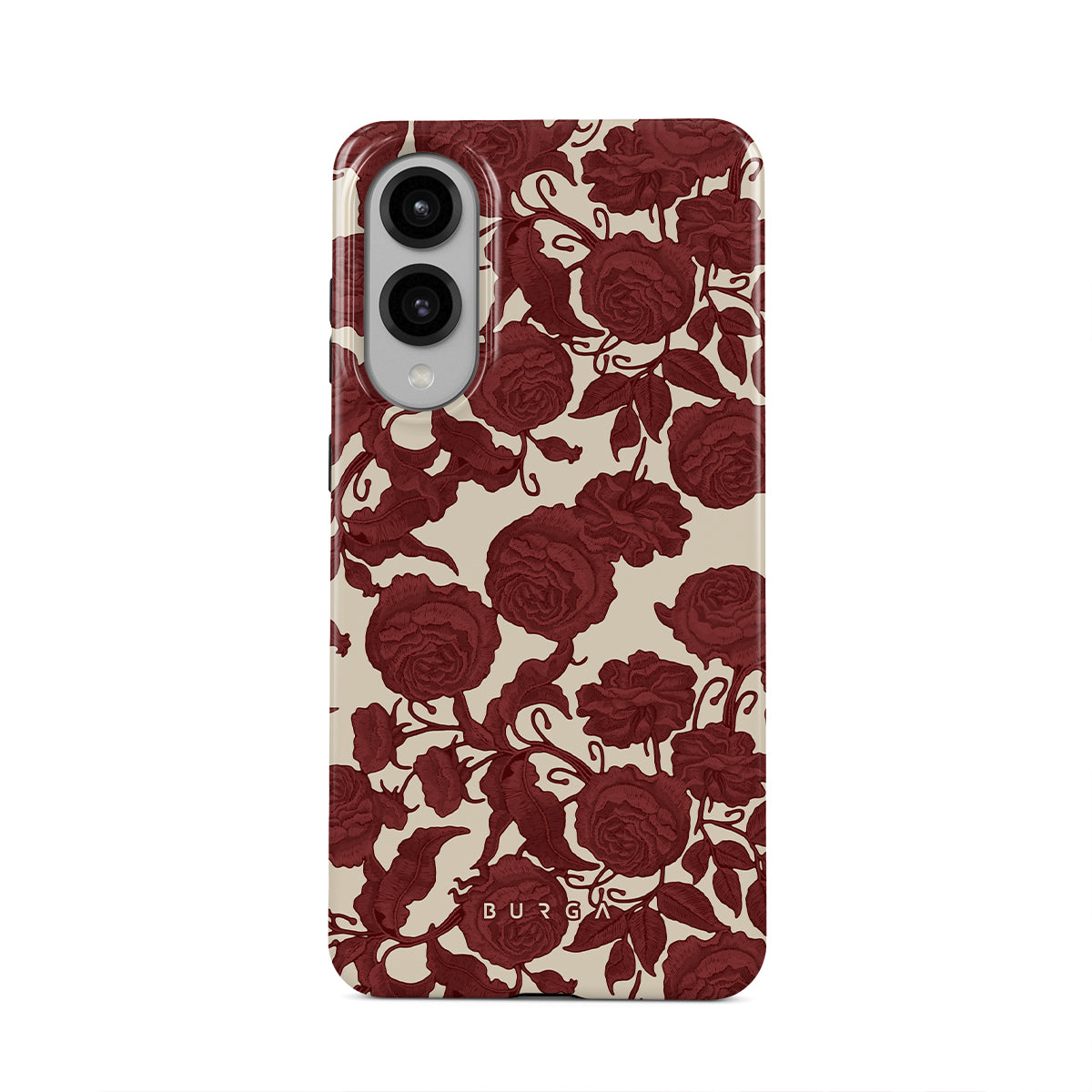 Główne elementy projektu: ciemnoczerwone róże, misterny wzór kwiatowy, wzór vintage.