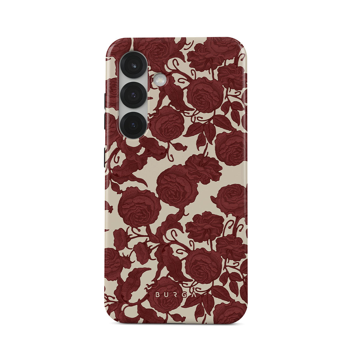 Główne elementy projektu: ciemnoczerwone róże, misterny wzór kwiatowy, wzór vintage.