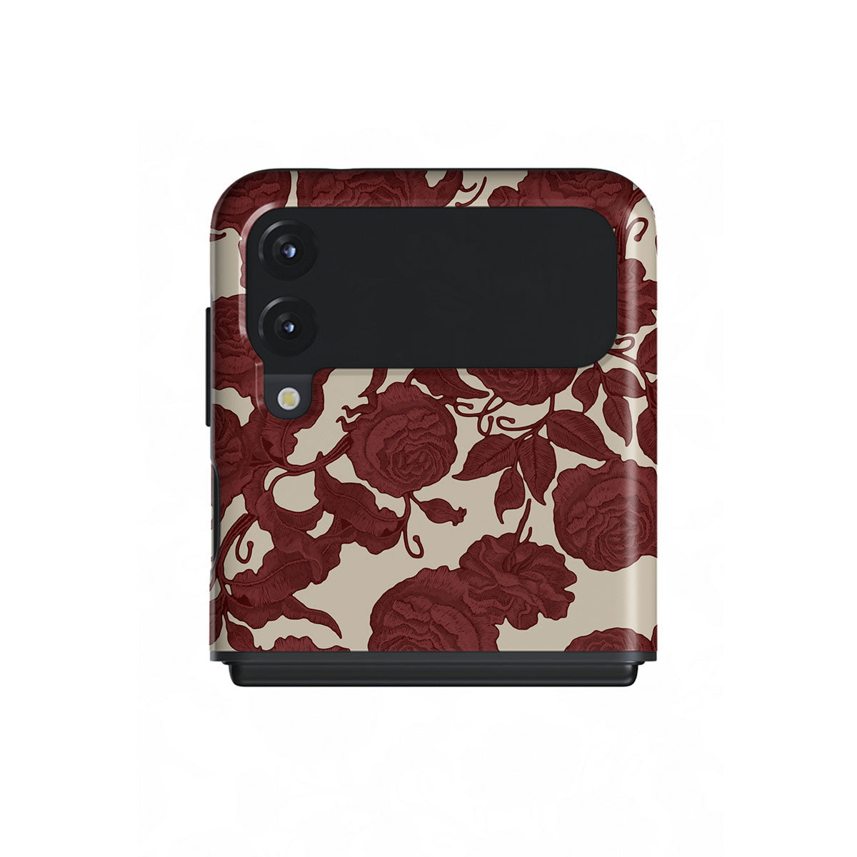 Główne elementy projektu: ciemnoczerwone róże, misterny wzór kwiatowy, wzór vintage.
