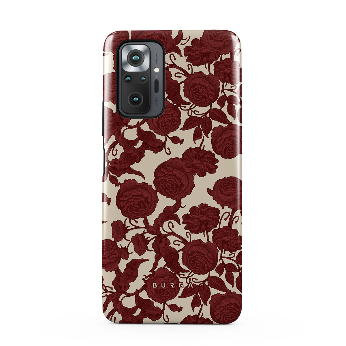 Główne elementy projektu: ciemnoczerwone róże, misterny wzór kwiatowy, wzór vintage.