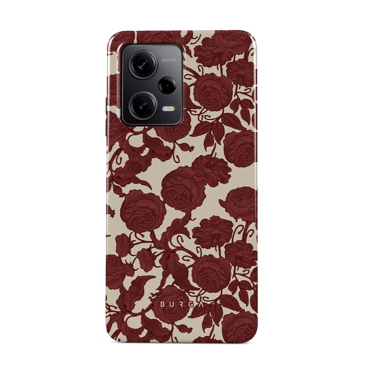 Główne elementy projektu: ciemnoczerwone róże, misterny wzór kwiatowy, wzór vintage.