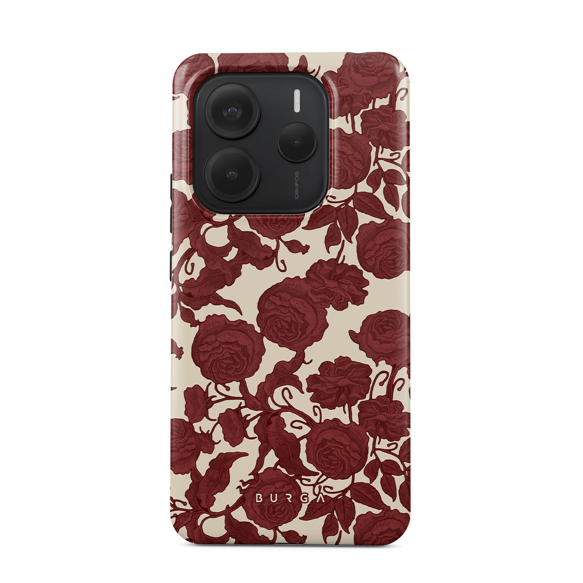 Główne elementy projektu: ciemnoczerwone róże, misterny wzór kwiatowy, wzór vintage.
