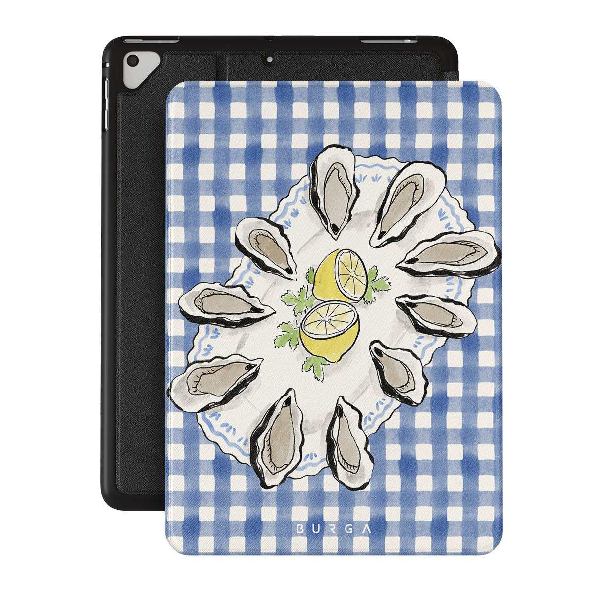 Główne elementy projektu: Ostrygi, cytryny, niebieski w kratkę, świeże elementy nadmorskie, delikatne pastelowe odcienie.