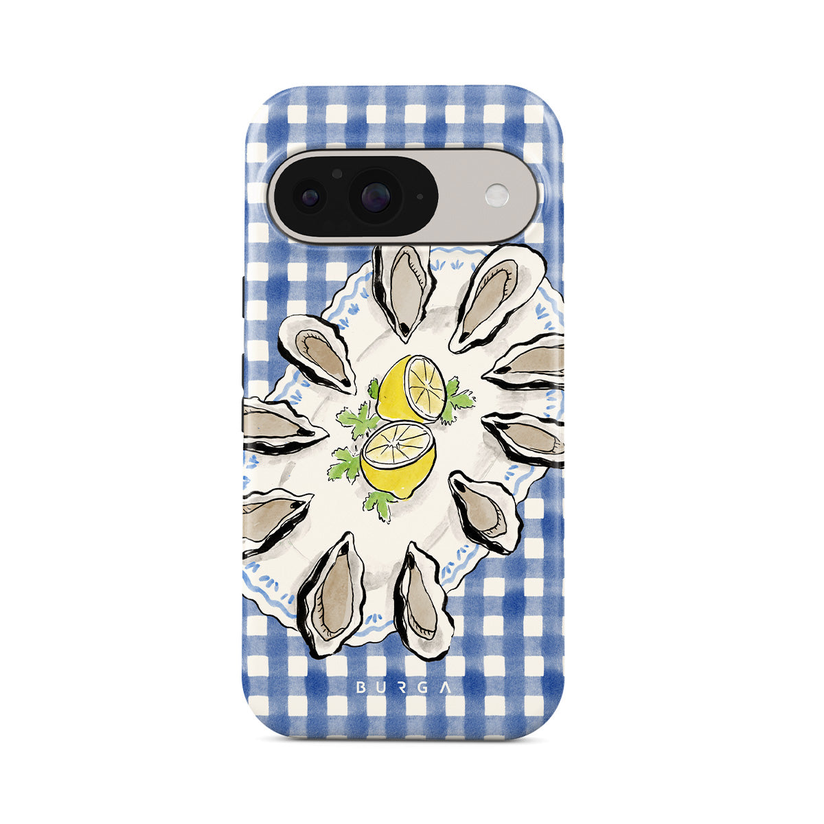 Główne elementy projektu: Ostrygi, cytryny, niebieski w kratkę, świeże elementy nadmorskie, delikatne pastelowe odcienie.