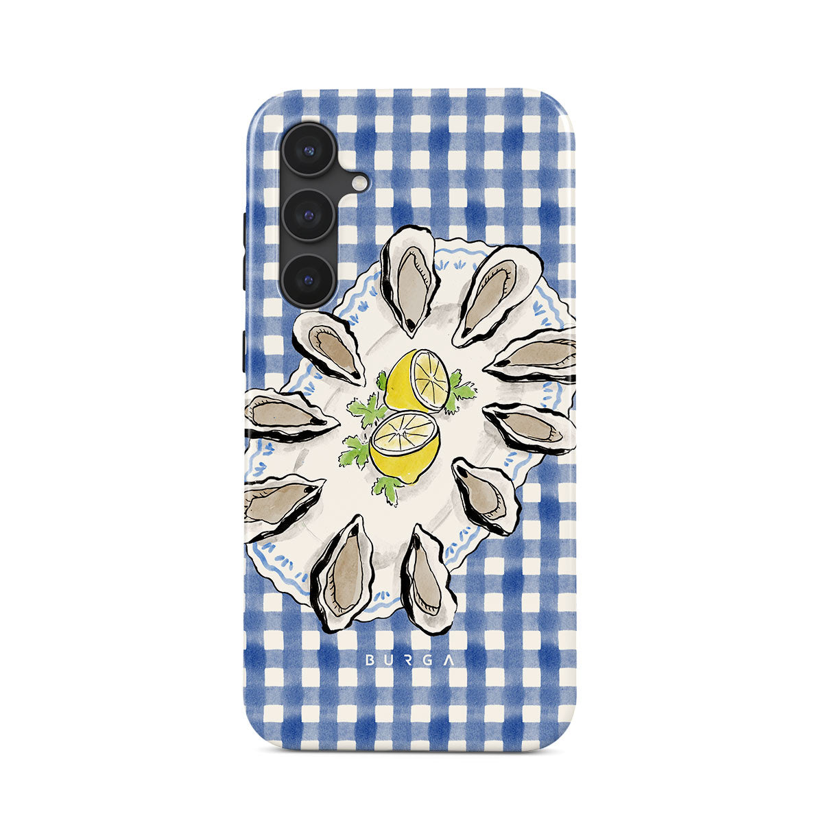 Główne elementy projektu: Ostrygi, cytryny, niebieski w kratkę, świeże elementy nadmorskie, delikatne pastelowe odcienie.