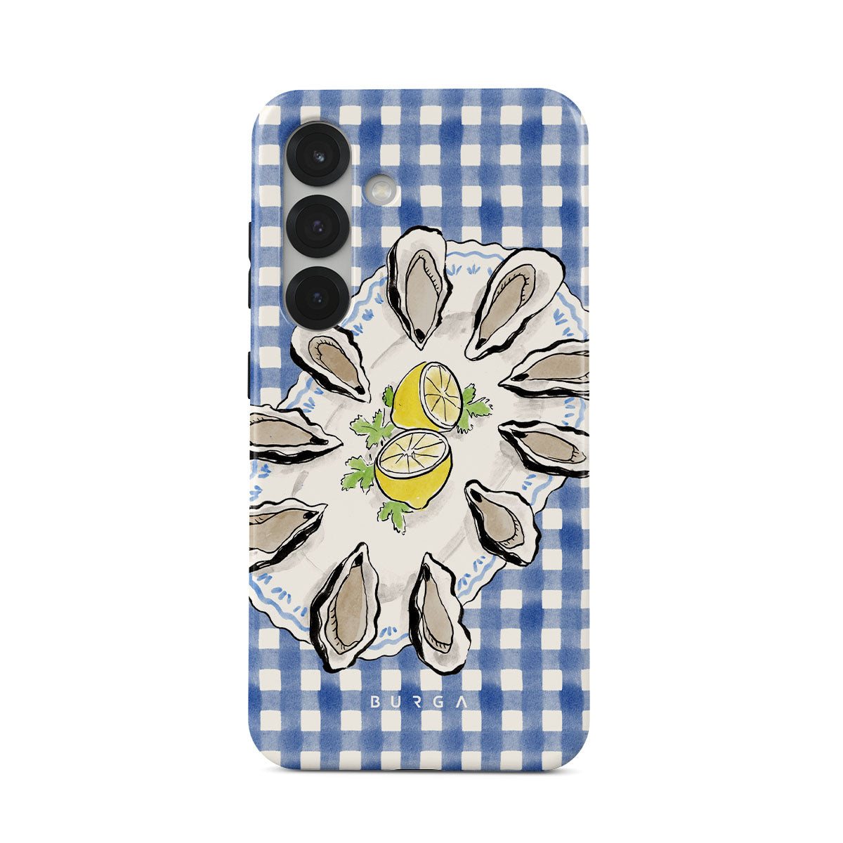 Główne elementy projektu: Ostrygi, cytryny, niebieski w kratkę, świeże elementy nadmorskie, delikatne pastelowe odcienie.