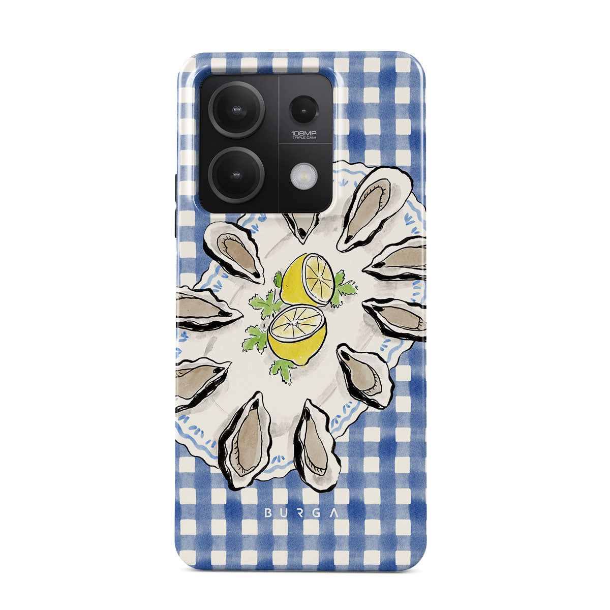 Główne elementy projektu: Ostrygi, cytryny, niebieski w kratkę, świeże elementy nadmorskie, delikatne pastelowe odcienie.