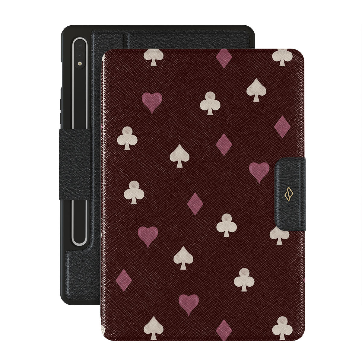 Główne elementy projektu: symbole kart, serca, piki, karo, trefle, bordowe tło