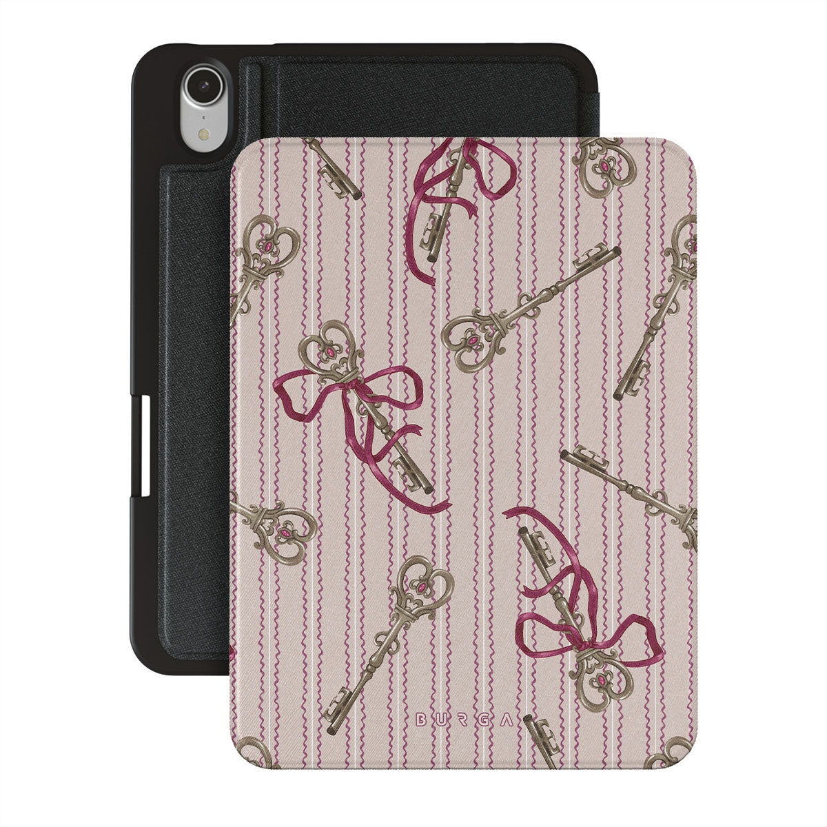 Główne elementy projektu: antyczne klucze, kokardy, różowe wstążki, paskowane tło
