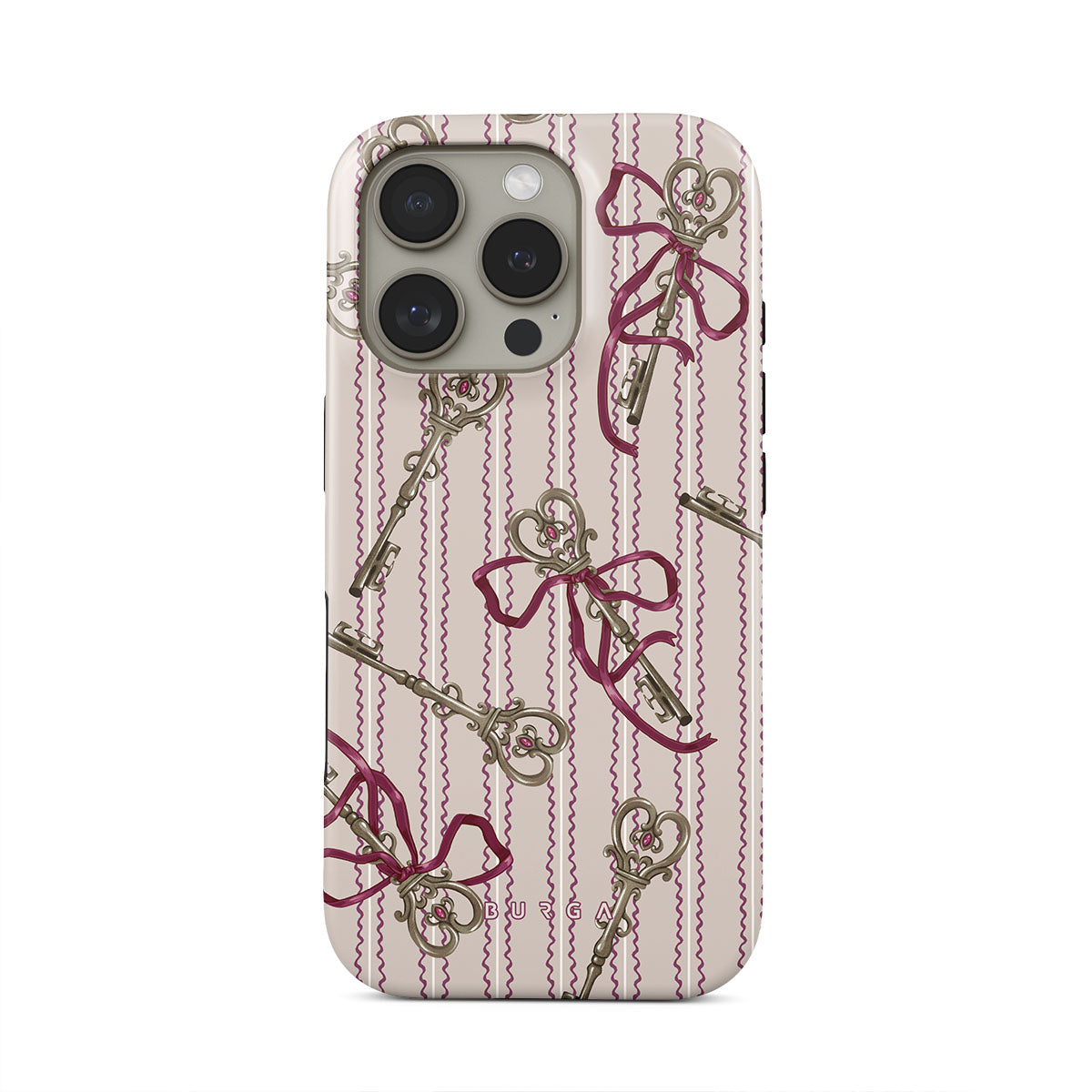 Główne elementy projektu: antyczne klucze, kokardy, różowe wstążki, paskowane tło