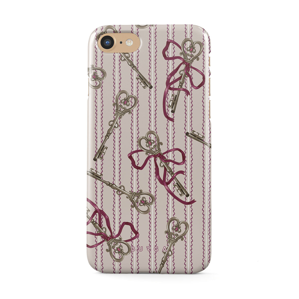Główne elementy projektu: antyczne klucze, kokardy, różowe wstążki, paskowane tło