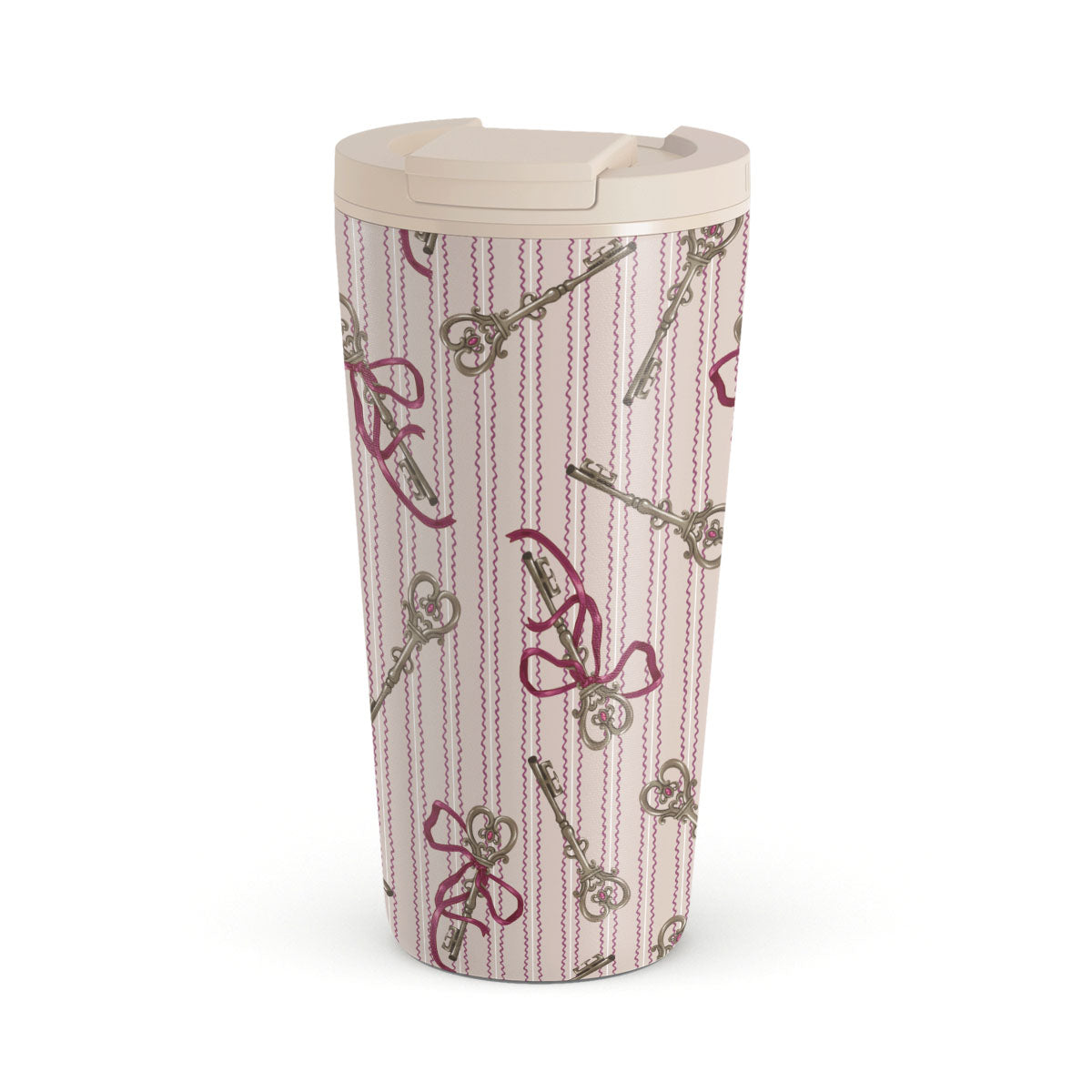 Główne elementy projektu: antyczne klucze, kokardy, różowe wstążki, paskowane tło
