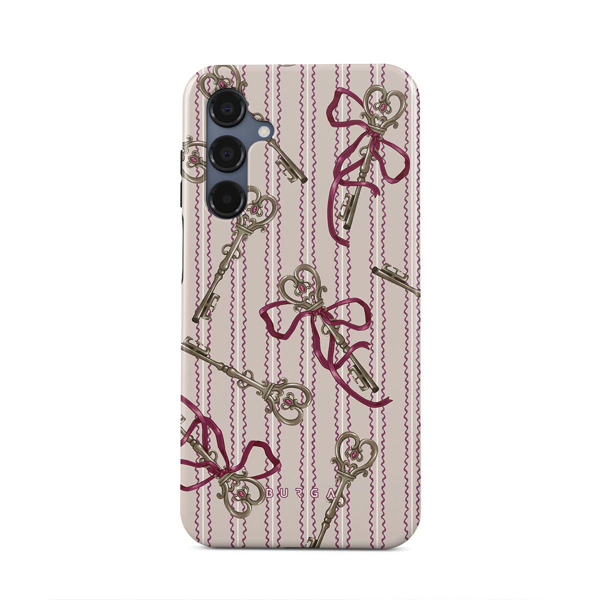 Główne elementy projektu: antyczne klucze, kokardy, różowe wstążki, paskowane tło