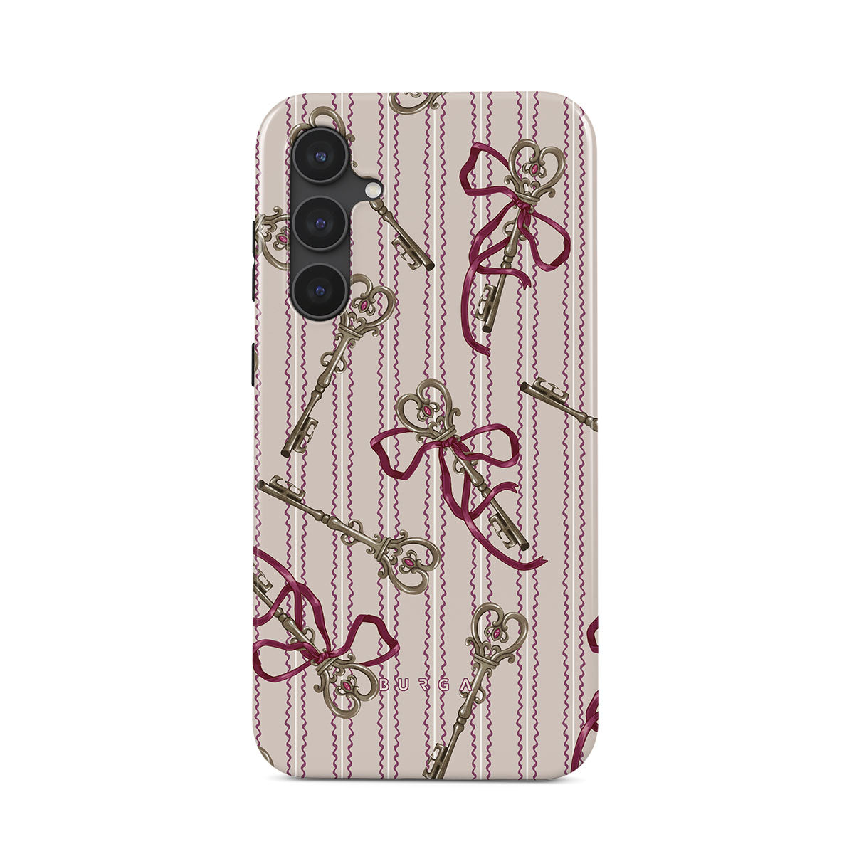 Główne elementy projektu: antyczne klucze, kokardy, różowe wstążki, paskowane tło