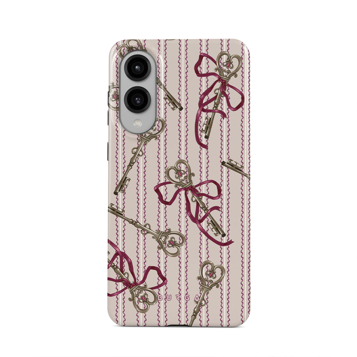 Główne elementy projektu: antyczne klucze, kokardy, różowe wstążki, paskowane tło