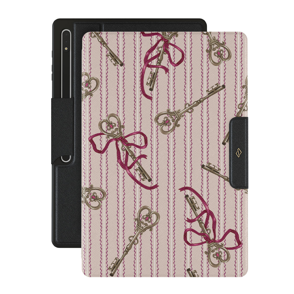 Główne elementy projektu: antyczne klucze, kokardy, różowe wstążki, paskowane tło