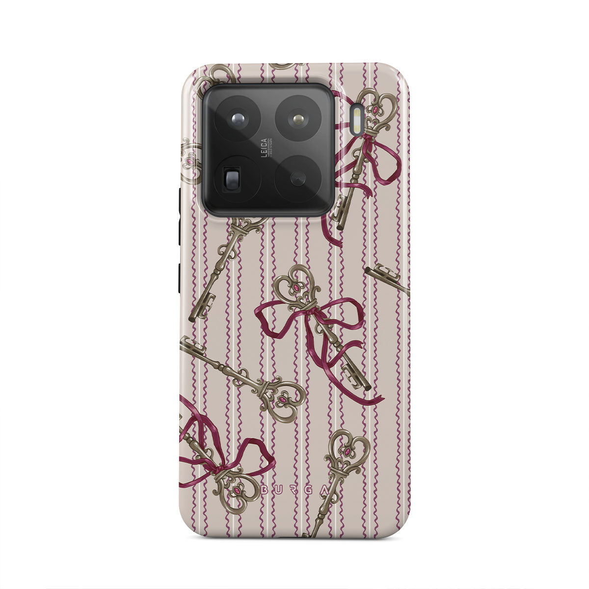 Główne elementy projektu: antyczne klucze, kokardy, różowe wstążki, paskowane tło