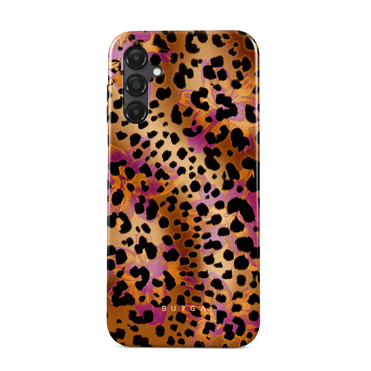 Główne elementy projektu: nadruk z leopardem, brązowy, pomarańczowy, fioletowy, nadruk zwierzęcy.