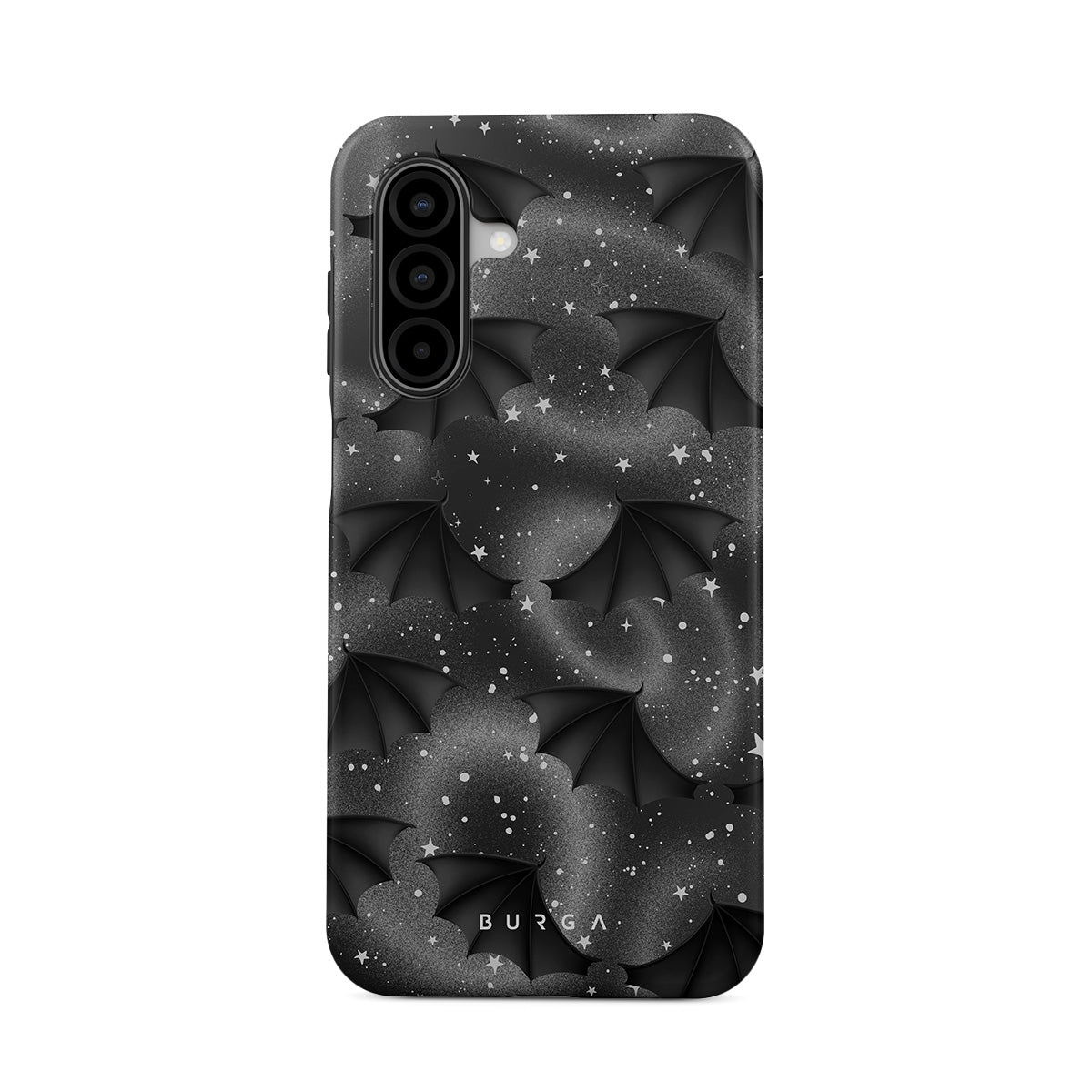 Główne elementy projektu: skrzydła nietoperza, gwiazdy, mistyczne wiry, czarne niebo