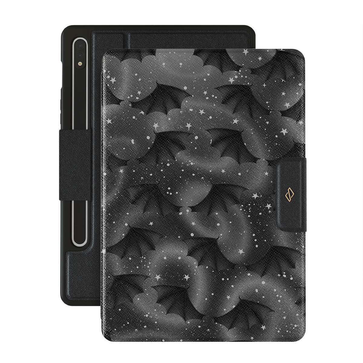 Główne elementy projektu: skrzydła nietoperza, gwiazdy, mistyczne wiry, czarne niebo